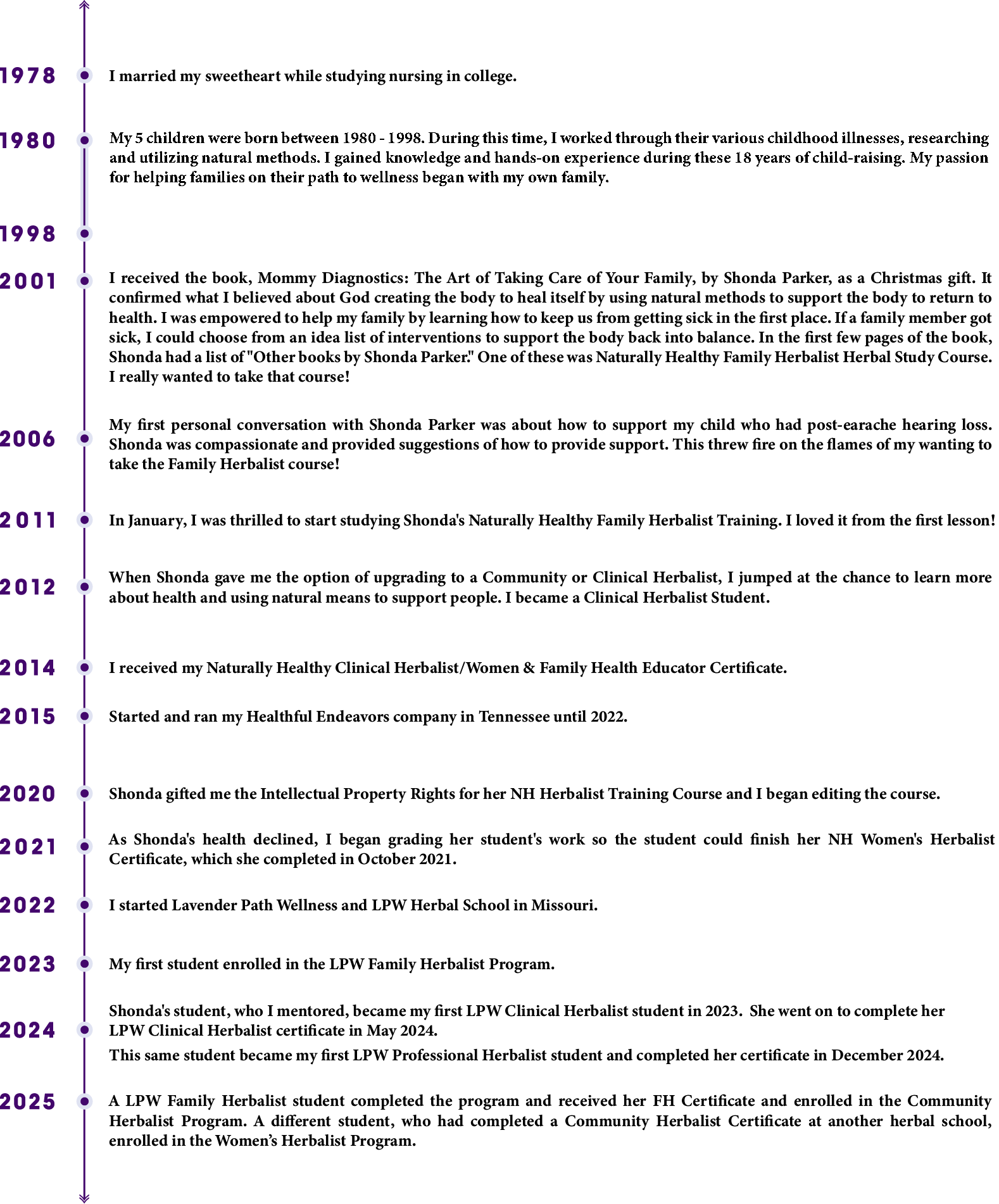 As a Certified Clinical Herbalist, Joni, through her LPW Herbal School, provides certificates of completion for the Family Herbalist, Community Herbalist/Certified Family Health Educator, Certified Women’s Health Educator, Certified Clinical Herbalist, and/or Professional Herbalist programs.